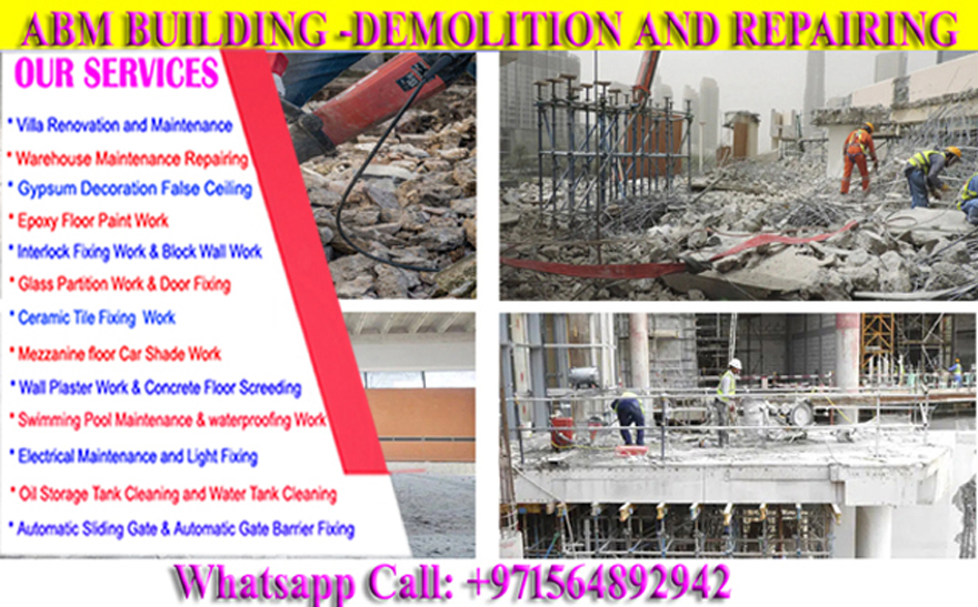 Villa Building Renovation and Maintenance GypsumPartition & False Ceiling – Building Painting – warehouse roof Hit Proofing Rockwool fixing .Warehouse Floor Painting –Car Parking Epoxyfloor Paint -Marine Ship Painting contracting –Air Condition – DuctInstallation Central AC – Split AC- Window AC- Water Cooler water & HeatersInstallation service. –Electrical Cabling -DB Board Installation and fixing-LCD FixingLight-LED fixing – Switches & Sockets-all Electrical Fittings Contracting–Civil Masonry & Tiles Fixing– InterlockFixing Contracting–Emergency plumbing repairs- Toilet –bath- Drains Block – Water Tank Cleaning and Plumbing –Aluminum Door & Shower Glass Works – Welding & Grilling -windrow Welding & Grilling Fixing -Stair Cress Welding & Grilling Fixing Car Parking Welding & Grilling Manufacturing & Fixing -SwimmingPull Area Grill roof top Clay Tile fixing – Thai Aluminum Temper Glass Installation.Interior INTERIOR company ect. 971564892942