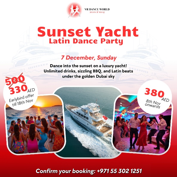 Get ready for the ultimate Latin dance adventure on Dubai’s waters! VR Dance World (Shan & Raai) brings you the Sunset Yacht Latin Dance Party on December 7th.